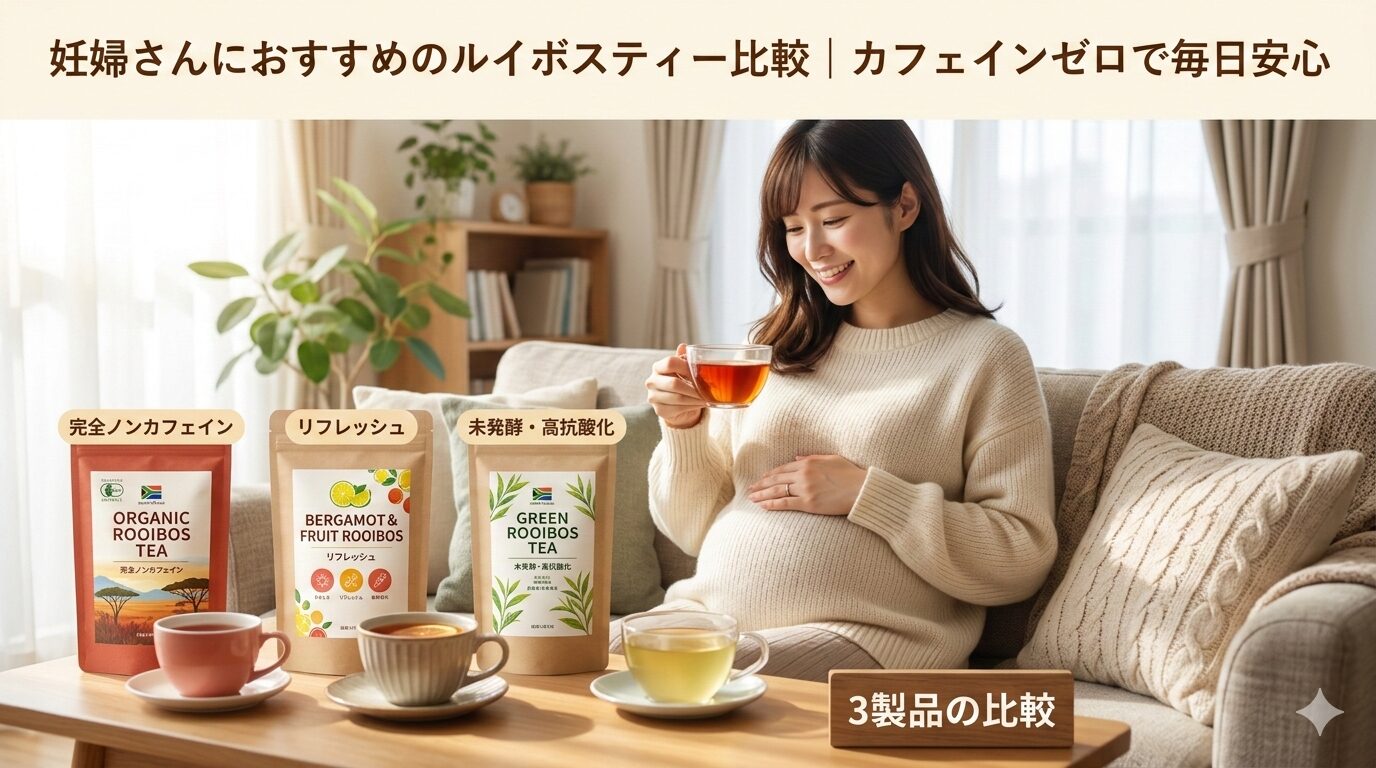 「妊娠中はカフェインがNGと聞いて、コーヒーも緑茶も我慢している…でも何か温かい飲み物が飲みたい」 そんな妊婦さんに大人気なのがルイボスティーです。完全ノンカフェインで、ミネラルも豊富。妊娠中から産後の授乳期まで安心して飲めるお茶として、今や定番の存在になっています。今回はおすすめのルイボスティーを3製品比較してご紹介します。