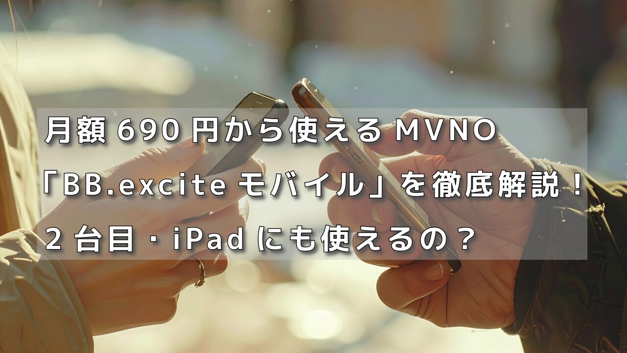 「スマホの通信費、もう少し安くならないかな」と思いつつ、格安SIMへの乗り換えに踏み切れていない方は多いと思います。そんな方にぜひ知ってほしいのが、BB.exciteモバイル。なんと月額690円からスマホやタブレットを使えてしまう、いま注目のMVNOサービスです。